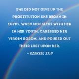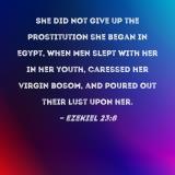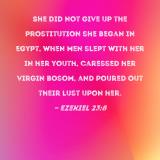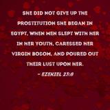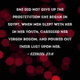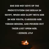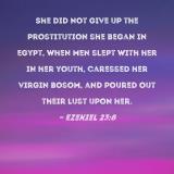 She did not give up the prostitution she began in Egypt, when men slept with her in her youth, caressed her virgin bosom, and poured out their lust upon her.