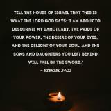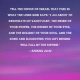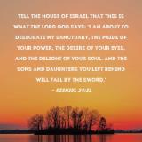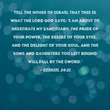 Pictures and Artwork Tell the house of Israel that this is what the Lord GOD says: 'I am about to desecrate My sanctuary, the pride of your power, the desire of your eyes, and the delight of your soul. And the sons and daughters you left behind will fall by the sword.' |