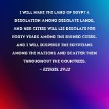 Pictures and Artwork I will make the land of Egypt a desolation among desolate lands, and her cities will lie desolate for forty years among the ruined cities. And I will disperse the Egyptians among the nations and scatter them throughout the countries. |