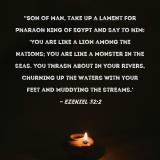 Pictures and Artwork "Son of man, take up a lament for Pharaoh king of Egypt and say to him: 'You are like a lion among the nations; you are like a monster in the seas. You thrash about in your rivers, churning up the waters with your feet and muddying the streams.' |