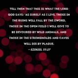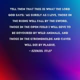Pictures and Artwork Tell them that this is what the Lord GOD says: 'As surely as I live, those in the ruins will fall by the sword, those in the open field I will give to be devoured by wild animals, and those in the strongholds and caves will die by plague. |