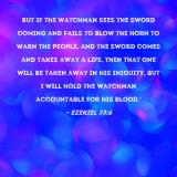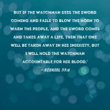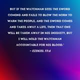 Pictures and Artwork But if the watchman sees the sword coming and fails to blow the horn to warn the people, and the sword comes and takes away a life, then that one will be taken away in his iniquity, but I will hold the watchman accountable for his blood.' |