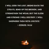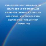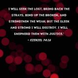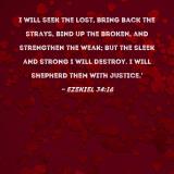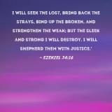 I will seek the lost, bring back the strays, bind up the broken, and strengthen the weak; but the sleek and strong I will destroy. I will shepherd them with justice.'