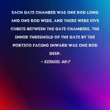 Each gate chamber was one rod long and one rod wide, and there were five cubits between the gate chambers. The inner threshold of the gate by the portico facing inward was one rod deep.