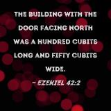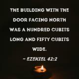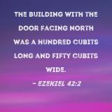 The building with the door facing north was a hundred cubits long and fifty cubits wide.