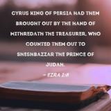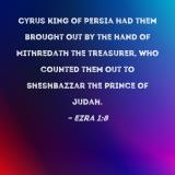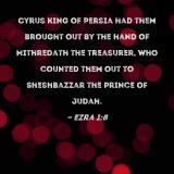 Cyrus king of Persia had them brought out by the hand of Mithredath the treasurer, who counted them out to Sheshbazzar the prince of Judah.