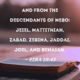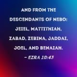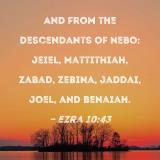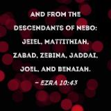 And from the descendants of Nebo: Jeiel, Mattithiah, Zabad, Zebina, Jaddai, Joel, and Benaiah.