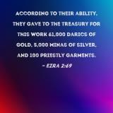 According to their ability, they gave to the treasury for this work 61,000 darics of gold, 5,000 minas of silver, and 100 priestly garments.