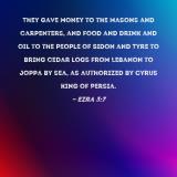 They gave money to the masons and carpenters, and food and drink and oil to the people of Sidon and Tyre to bring cedar logs from Lebanon to Joppa by sea, as authorized by Cyrus king of Persia.