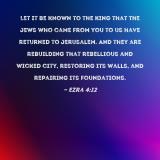 Let it be known to the king that the Jews who came from you to us have returned to Jerusalem. And they are rebuilding that rebellious and wicked city, restoring its walls, and repairing its foundations.