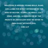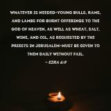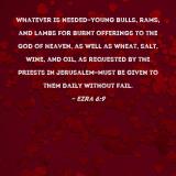 Whatever is needed--young bulls, rams, and lambs for burnt offerings to the God of heaven, as well as wheat, salt, wine, and oil, as requested by the priests in Jerusalem--must be given to them daily without fail.