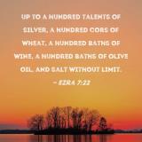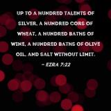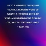 up to a hundred talents of silver, a hundred cors of wheat, a hundred baths of wine, a hundred baths of olive oil, and salt without limit.