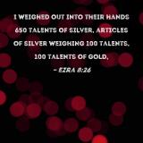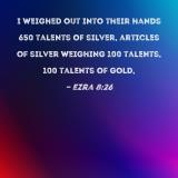 I weighed out into their hands 650 talents of silver, articles of silver weighing 100 talents, 100 talents of gold,