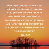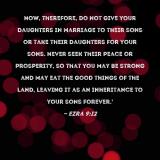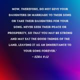 Pictures and Artwork Now, therefore, do not give your daughters in marriage to their sons or take their daughters for your sons. Never seek their peace or prosperity, so that you may be strong and may eat the good things of the land, leaving it as an inheritance to your sons forever.' |