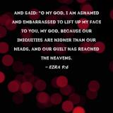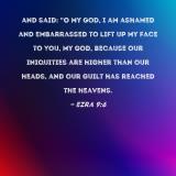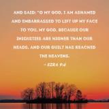 and said: "O my God, I am ashamed and embarrassed to lift up my face to You, my God, because our iniquities are higher than our heads, and our guilt has reached the heavens.