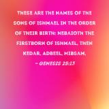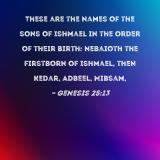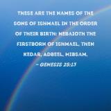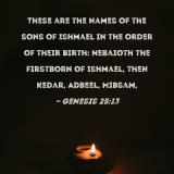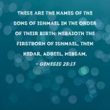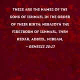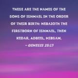 These are the names of the sons of Ishmael in the order of their birth: Nebaioth the firstborn of Ishmael, then Kedar, Adbeel, Mibsam,