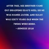 After this, his brother came out grasping Esau's heel; so he was named Jacob. And Isaac was sixty years old when the twins were born.
