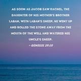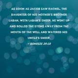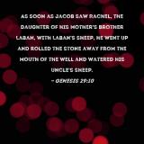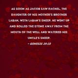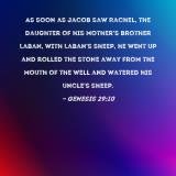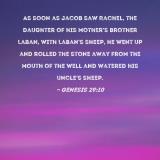 As soon as Jacob saw Rachel, the daughter of his mother's brother Laban, with Laban's sheep, he went up and rolled the stone away from the mouth of the well and watered his uncle's sheep.