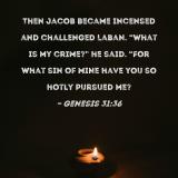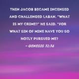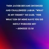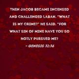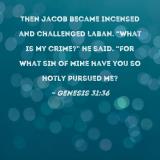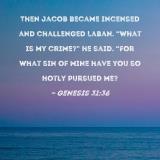 Then Jacob became incensed and challenged Laban. "What is my crime?" he said. "For what sin of mine have you so hotly pursued me?