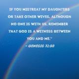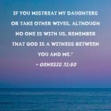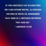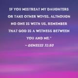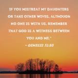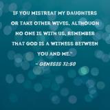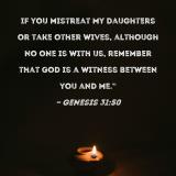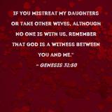 If you mistreat my daughters or take other wives, although no one is with us, remember that God is a witness between you and me."