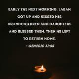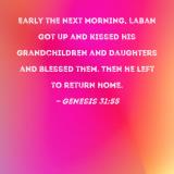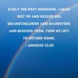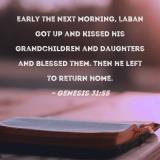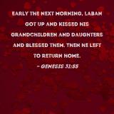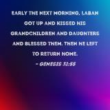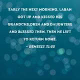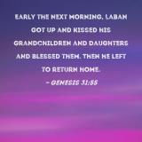 Early the next morning, Laban got up and kissed his grandchildren and daughters and blessed them. Then he left to return home.