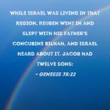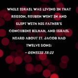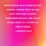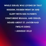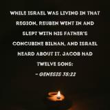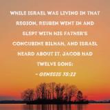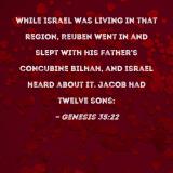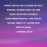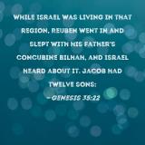 While Israel was living in that region, Reuben went in and slept with his father's concubine Bilhah, and Israel heard about it. Jacob had twelve sons: