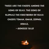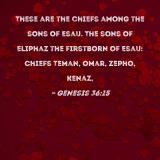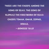 These are the chiefs among the sons of Esau. The sons of Eliphaz the firstborn of Esau: Chiefs Teman, Omar, Zepho, Kenaz,