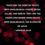 These are the sons of Esau's wife Oholibamah: Chiefs Jeush, Jalam, and Korah. They are the chiefs descended from Esau's wife Oholibamah, the daughter of Anah.