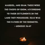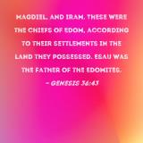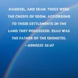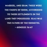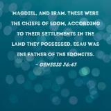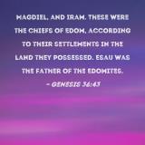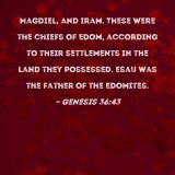 Magdiel, and Iram. These were the chiefs of Edom, according to their settlements in the land they possessed. Esau was the father of the Edomites.