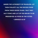 Under the authority of Pharaoh, let them collect all the excess food from these good years, that they may come and lay up the grain to be preserved as food in the cities.