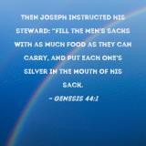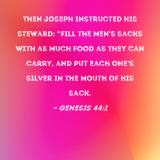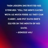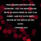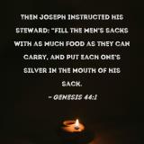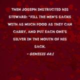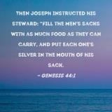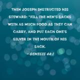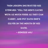 Then Joseph instructed his steward: "Fill the men's sacks with as much food as they can carry, and put each one's silver in the mouth of his sack.
