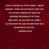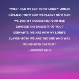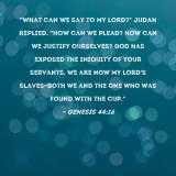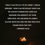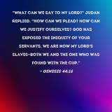 "What can we say to my lord?" Judah replied. "How can we plead? How can we justify ourselves? God has exposed the iniquity of your servants. We are now my lord's slaves--both we and the one who was found with the cup."