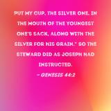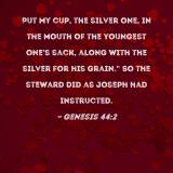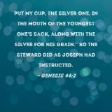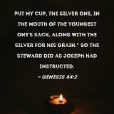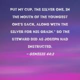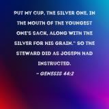 Put my cup, the silver one, in the mouth of the youngest one's sack, along with the silver for his grain." So the steward did as Joseph had instructed.