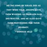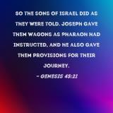 So the sons of Israel did as they were told. Joseph gave them wagons as Pharaoh had instructed, and he also gave them provisions for their journey.