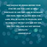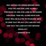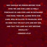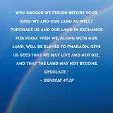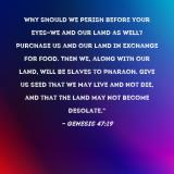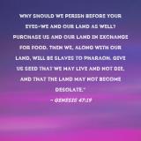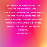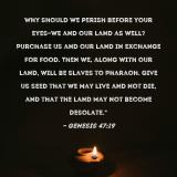Pictures and Artwork Why should we perish before your eyes--we and our land as well? Purchase us and our land in exchange for food. Then we, along with our land, will be slaves to Pharaoh. Give us seed that we may live and not die, and that the land may not become desolate." |