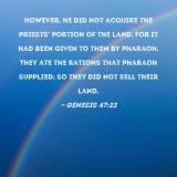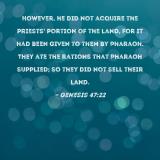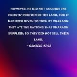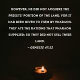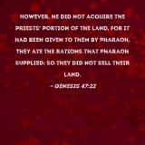 However, he did not acquire the priests' portion of the land, for it had been given to them by Pharaoh. They ate the rations that Pharaoh supplied; so they did not sell their land.