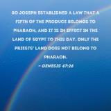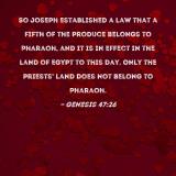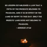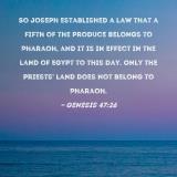 So Joseph established a law that a fifth of the produce belongs to Pharaoh, and it is in effect in the land of Egypt to this day. Only the priests' land does not belong to Pharaoh.