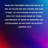 When the time drew near for Israel to die, he called his son Joseph and said to him, "If I have found favor in your eyes, put your hand under my thigh and promise to show me kindness and faithfulness. Do not bury me in Egypt,