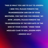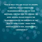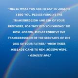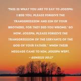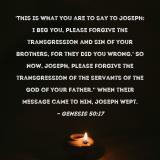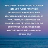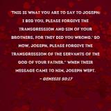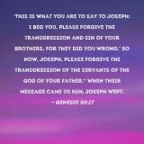 Pictures and Artwork This is what you are to say to Joseph: I beg you, please forgive the transgression and sin of your brothers, for they did you wrong.' So now, Joseph, please forgive the transgression of the servants of the God of your father." When their message came to him, Joseph wept. |