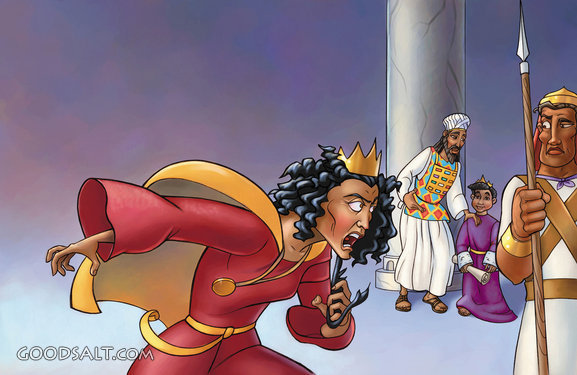 The Wicked Queen 2 2 Kings 11:12-14 child, anger, wicked, priest, temple, ruler, king, queen, palace, guard, high priest, the wicked queen 2, flip out, livid PROJECTION - License for PowerPoint™ PRINT – buy a print of this picture; optional frame Bible Hub |
