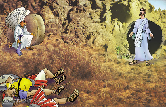 The Resurrection Matthew 28:1-10 Mark 16:1-11 Luke 24:1-12 John 20:1-18 angel, Jesus, kneel, faint, stone, morning, tomb, cartoon, resurrection, easter, soldiers PROJECTION - License for PowerPoint™ PRINT – buy a print of this picture; optional frame Bible Hub |