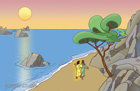 walk, Jesus, john, disciple, shore, patmos, cartoon, exile