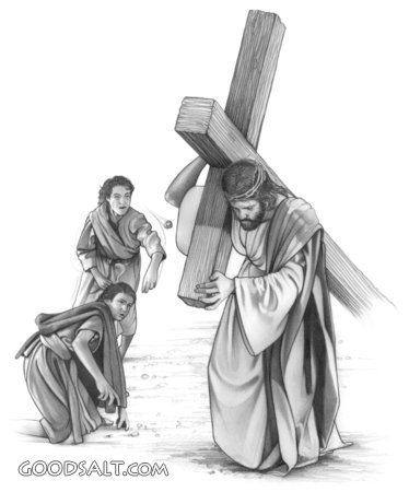Jesus Carries Cross John 19:17 salvation, carrying, christ, Jesus, stoning, mock, ridicule, death, cross, torture, throwing, sacrifice, easter, passion, crucifixion PROJECTION - License for PowerPoint™ PRINT – buy a print of this picture; optional frame Bible Hub |