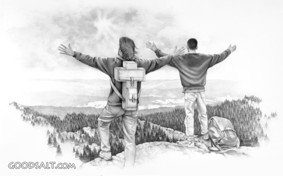 Hikers Climb the Top Matthew 16:24 Galatians 6:14 raised, hiking, two, climbing, backpack, rejoice, rejoicing, mountain, rock, cliff, men, cross, male, bag, arm, hikers PROJECTION - License for PowerPoint™ PRINT – buy a print of this picture; optional frame Bible Hub |