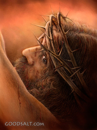 Face of Jesus Looking over Shoulder While on Cross John 19:2 crucifix, christ, Jesus, nailed, thorn, hang, crown, nail, cross, of, hanging, easter, passion, crucifixion, art, images, Pictures, pics PROJECTION - License for PowerPoint™ PRINT – buy a print of this picture; optional frame Bible Hub |