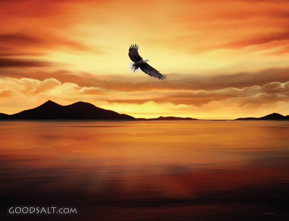 flying, bird, soaring, lake, sunset, eagle, bald, silhouette, hills, wings