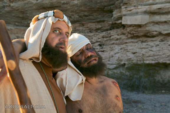 Injured Man Leans on a Good Samaritan Luke 10:33-35 rocky, holding, helping, injured, samaritan, injury, levite, victim, wounded, tending, kindly, closeup, hill, rock, man, men, road, close, up, headdress, good PROJECTION - License for PowerPoint™ PRINT – buy a print of this picture; optional frame Bible Hub |
