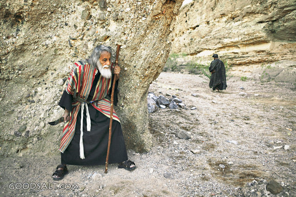 Isrealite Man Lurks behind Rock Holding Knife Luke 10:30 israelite, crouching, enemy, robbing, cliff, knife, staff, thief, prophet, hide, hiding, stick, patriarch, ambush, rob PROJECTION - License for PowerPoint™ PRINT – buy a print of this picture; optional frame Bible Hub |