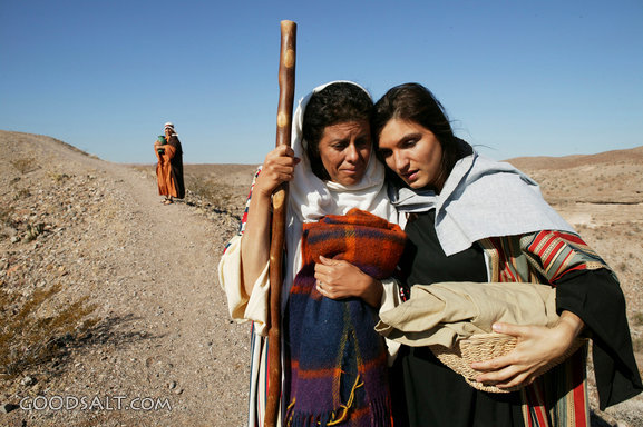 Two of Three Isrealite Woman Depart Company While on Journe Ruth 1:8-18 desert, sky, two, israelite, costume, journey, discussing, discussion, frown, frowning, hillside, cliff, women, three, path, staff, pole, road, group, headdress, walking, mountains, traveling, travelers, israelites PROJECTION - License for PowerPoint™ PRINT – buy a print of this picture; optional frame Bible Hub |