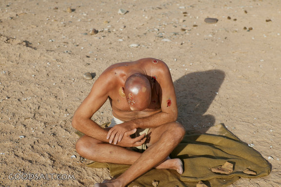 desert, sick, naked, sore, sand, head, man, blanket, sitting, sit, bald